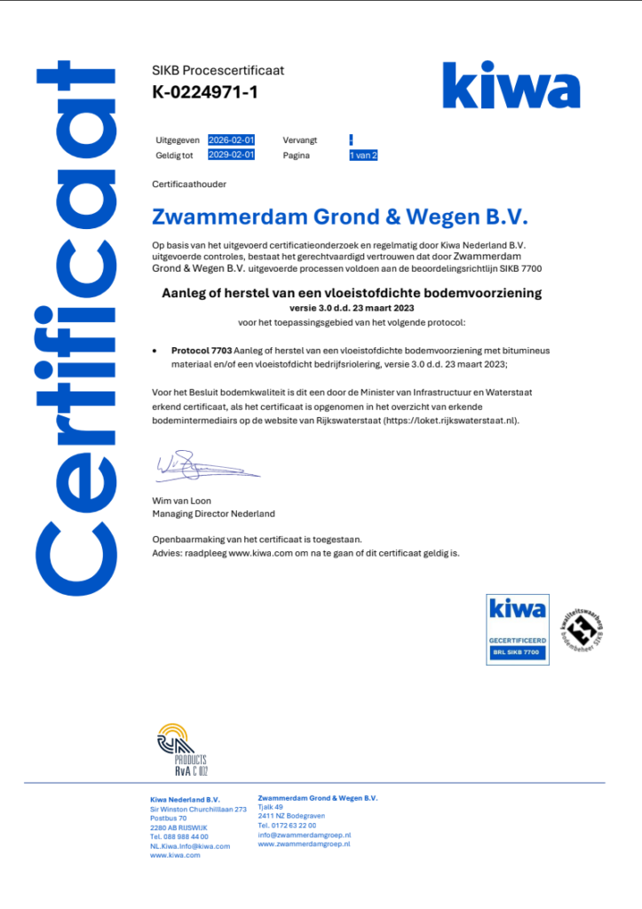 Zwammerdam Grond & Wegen B.V. heeft het BRL SIKB 7700 certificaat behaald, protocol 7703. Hiermee voldoet Zwammerdam Groep aan de eisen voor het aanleggen en herstellen van vloeistofdichte bodemvoorzieningen.